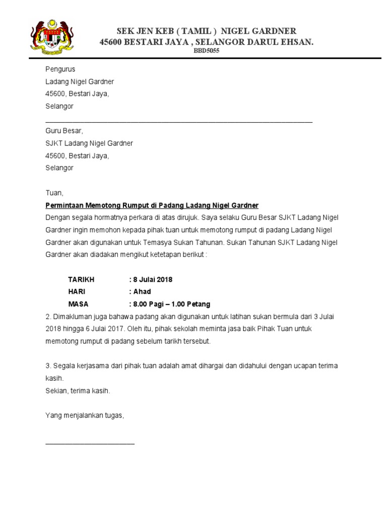 Contoh surat Talak satu. Surat Permohonan Bantuan Petugas Kebersihan untuk Memotong Rumput pada Hari Jumat Tanggal 10 Agustus 2018 Pukul 0730 WIB Lokasi Jl.